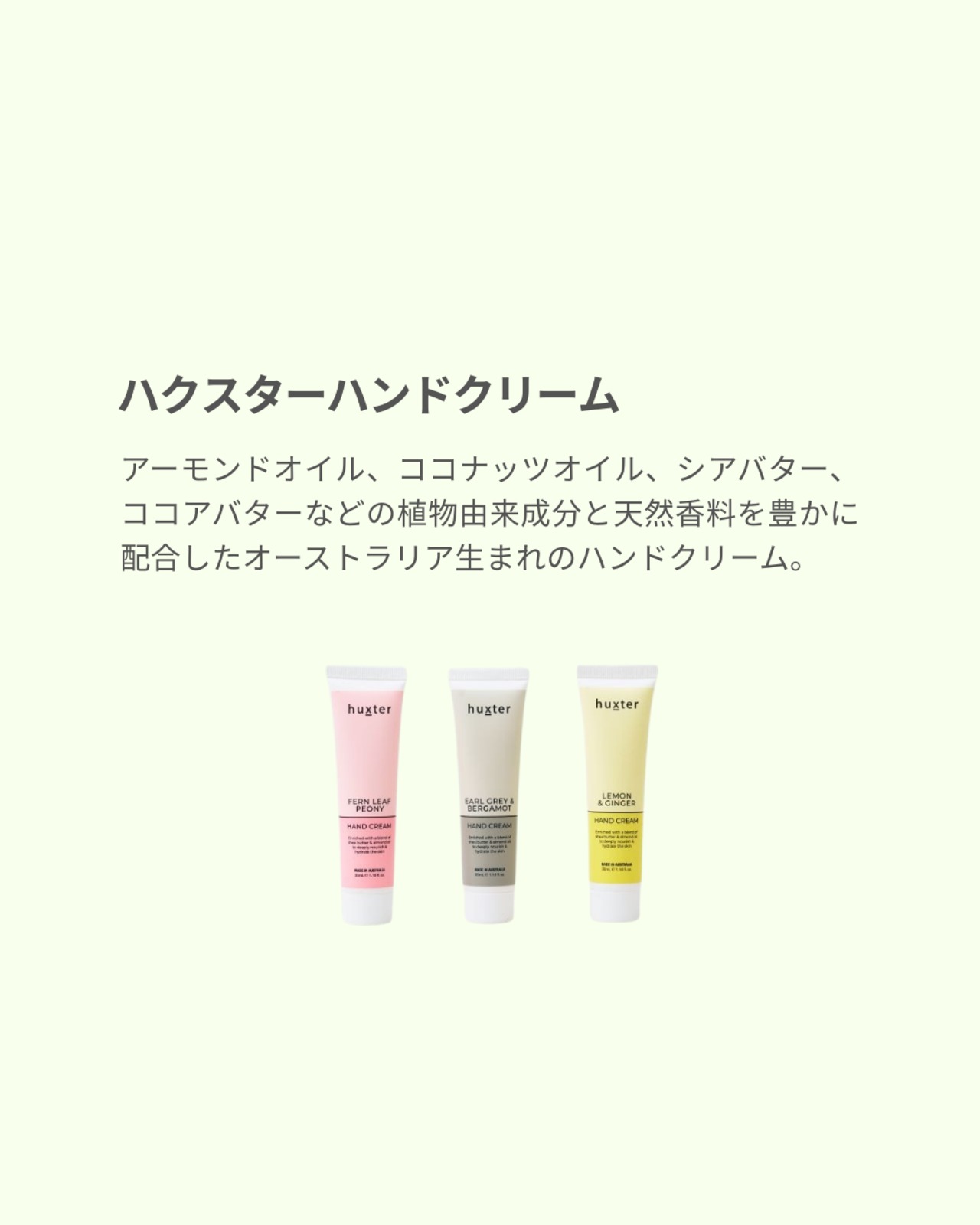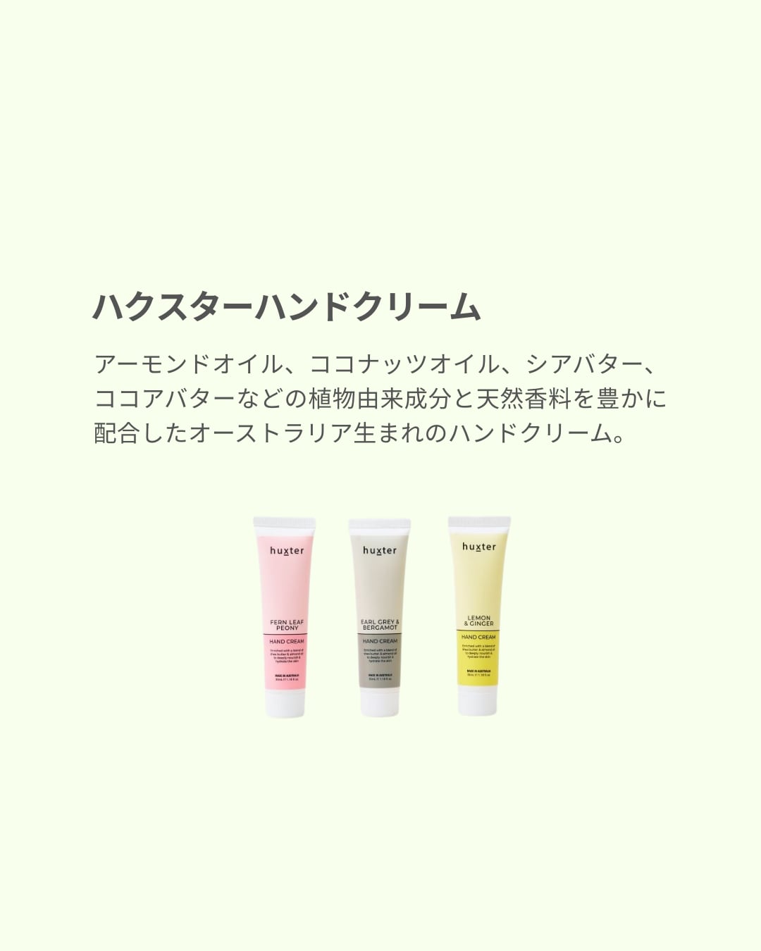 アーモンドオイル、ココナッツオイル、シアバター、ココアバターなどの植物由来成分と天然香料を豊かに配合したオーストラリア生まれのハンドクリーム。